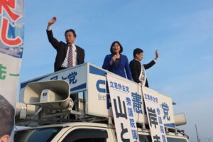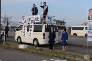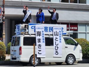 まずは、富山駅前にて、山としひろ衆議院議員(富山1区)と岡崎信也富山県議会議員と街頭演説を行いました。