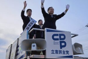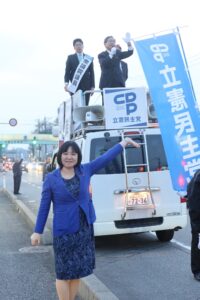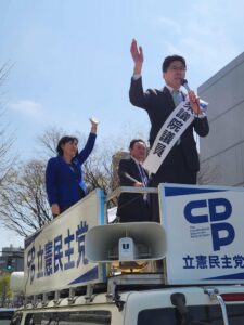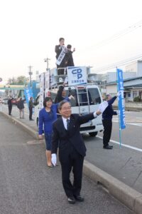 「村石あつし」富山市議会議員と合流し、市民の皆様に国政報告と市議との連携の重要性を訴えました。村石さんは医療従事者の出身です。