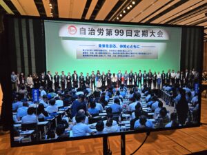 8月26日、27日とも自治労宇都宮大会を傍聴していました。最終日も各県本部から様々な意見が出され、石上中央執行委員長による総括答弁ののち、運動方針など各議案の採決、新執行部の選任、退任役員の表彰、戦後・被爆80年世界の恒久平和を希求する特別決議、大会宣言の採択が行われました。