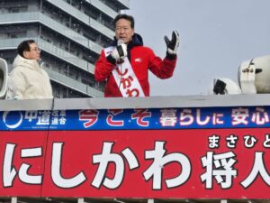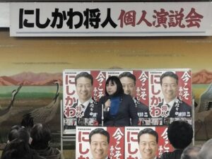安住幹事長は笑いをとりながらも、予算の年度内成立より選挙を優先させた髙市政権の問題点をわかりやすく演説し、「にしかわ将人」候補への支援を呼びかけました。