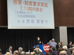 2月13日、自治労の先輩でもある野田那智子さんが会長を務める日本退職者連合の院内集会に参加させていただきました。